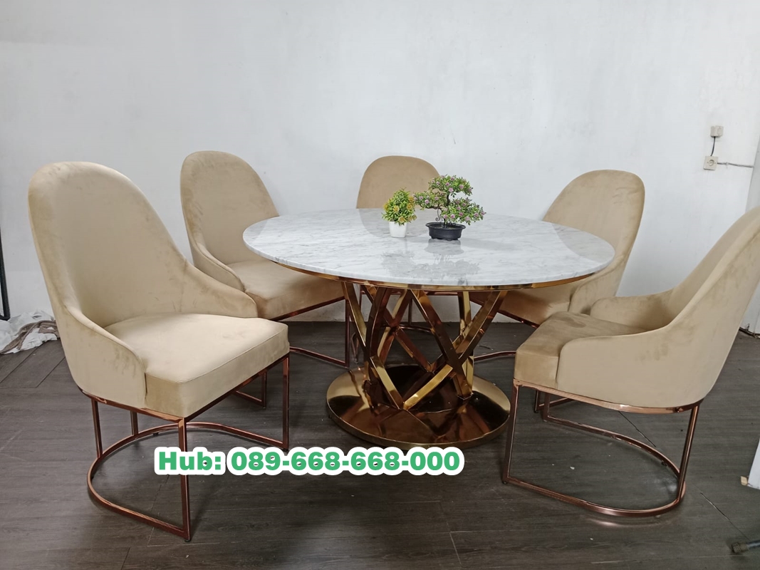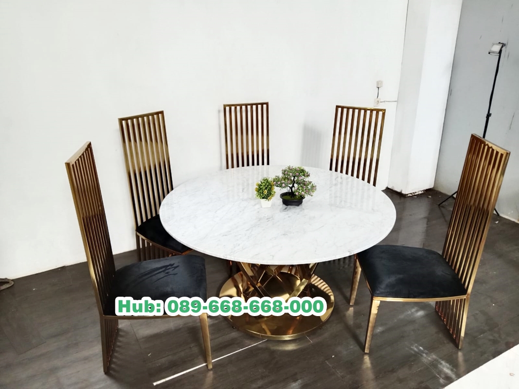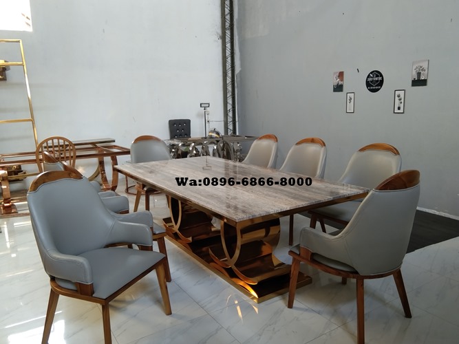 Kalau yang selanjutnya ini dengan kaki meja dari stainless yang juga tak kalah bagusnya dari kaki besi, yang mana stainless sendiri memiliki bentuk yang sangat kuat dan tahan lama tidak mudah berkarat juga, apalagi dengan modelnya yang stainless ini akan membuat meja makan tersebut terlihat begitu sangat mewah dan menawan dan juga di padukan dengan meja dari marmer pastinya sangat cocok sekali jika kaki meja nya dari stainless.