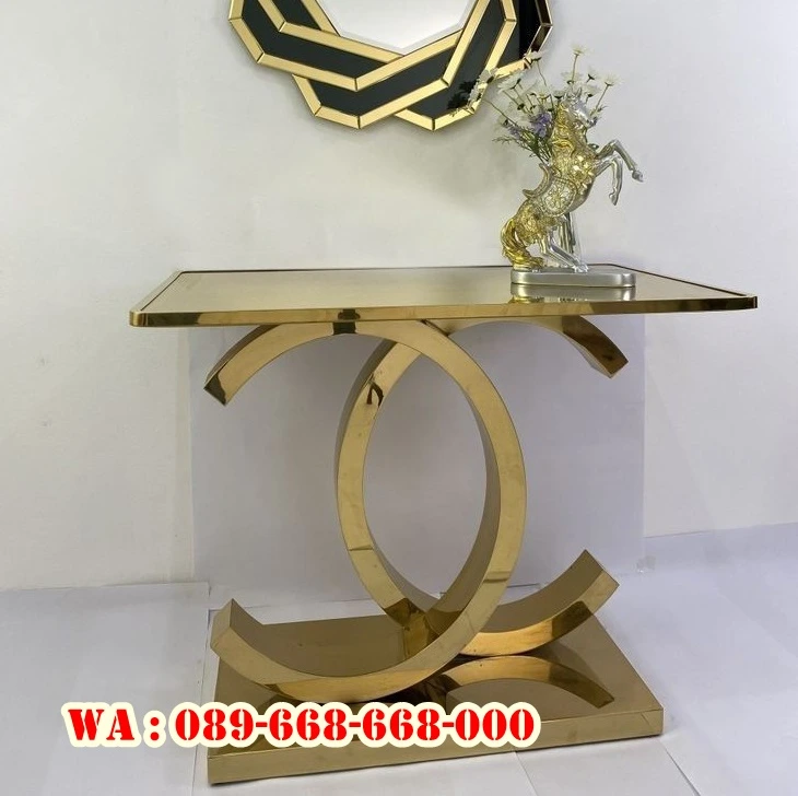 Meja konsul dirancang sebagai meja konsol untuk dinding ruang tamu, lorong, maupun area foyer, meja ini menyuguhkan kombinasi antara struktur logam stainless berkualitas tinggi dengan permukaan atas marmer asli atau kaca tempered. Bentuk kaki yang menyerupai logo Chanel menjadi titik fokus utama yang langsung mencuri perhatian, menjadikan meja ini tak hanya fungsional tapi juga sebagai elemen dekoratif yang kuat.