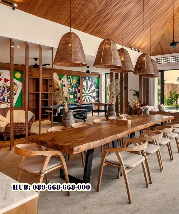 Perpaduan kayu utuh dengan kaki meja besi dirancang khusus untuk menghadirkan suasana profesional, elegan, dan berkelas di setiap ruang rapat, baik untuk perusahaan, hotel, restoran, maupun ruang konferensi seperti salah satu contioh pad gambar yang dapat anda lihat diatas. meja meeting dari bahan kayu trembesi dengan menggunkan kaki meja dari bahn besi cenderung lebih kokoh dan tahan lama sehingga saangat cocok untuk digunakan sebagai meja meeeting atau meja rapat namun desain yang minimalis tersebut jug bisa digunakan sebagai meja makan.