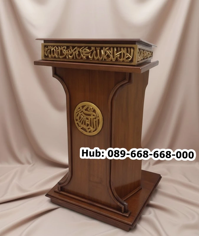 Penjelasan singkat mengenai podium adalah sebagai berikut. Podium merujuk pada tempat tinggi yang digunakan oleh khatib (pemberi khutbah) atau imam saat menyampaikan ceramah, khutbah Jumat, atau pelajaran keagamaan. Podium umumnya terbuat dari kayu yang kuat dan memiliki daya tahan tinggi, maka dari itu kami memilih kayu jati untuk produk yang satu ini. Selain karena daya tahan yang tinggi, kayu jati juga tidak mudah dimakan rayap, tidak mudah melengkung dan akan memiliki masa pakai yang sangat lama.