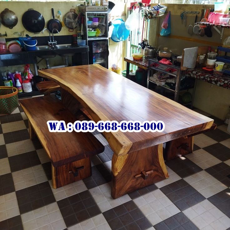 Meja ini terbuat dari kayu trembesi utuh (Suar Wood) yang memberikan kesan alami dan kokoh. Meja ini bervariasi, mulai dari bentuk alami tanpa pemangkasan hingga bentuk persegi panjang dengan tepian rapi. Tersedia dalam berbagai ukuran, mulai dari meja kecil hingga meja makan besar. Bisa diatur sesuai keinginan, dengan pilihan finishing natural yang menonjolkan urat kayu atau finishing closed pore yang halus. Dikerjakan oleh para profesional dari Jepara, sehingga menghasilkan furniture yang kokoh dan kuat.