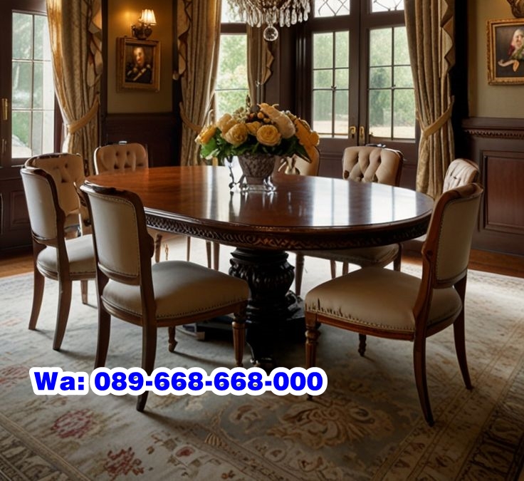 Meja makan ini memiliki desain elegan yang akan menambahkan sentuhan mewah pada ruang makan juga cocok untuk anda yang memiliki jumlah anggota keluarga yang banyak atau sering mengadakan acara makan bersama. Meja Kayu Jati Oval ini menggunakan bahan dari kayu jati solid pilihan, meja ini menampilkan lekukan oval yang lembut, menciptakan kesan ramah dan hangat dalam ruangan Anda. Serat alami kayu jati yang kaya dan berkarakter memperkuat kesan mewah dan eksklusif pada setiap sudut meja. kayu jati memiliki warna kecokelatan, mulai dari cokelat muda hingga tua, semakin tua warnanya semakin kaya serta Mengandung minyak alami yang melindungi dari hama salah satunya seperti rayap, dengan bahan kayu jati pilihan tentu saja akan sangat awet untuk anda gunakan bertahun tahun.