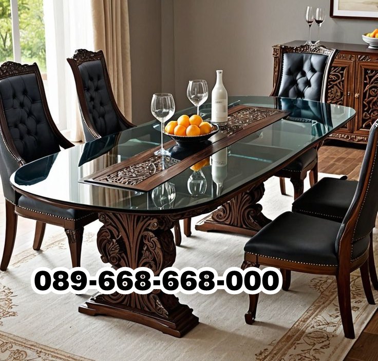 Meja makan jati kombinasi kaca tebal biasanya memiliki desain minimalis dan elegan. Kaki meja dibuat dari kayu jati yang kokoh, sementara permukaan meja menggunakan kaca tebal sebagai bagian utama. Desain ini memberikan tampilan yang ringan, tetapi tetap kokoh dan tahan lama.