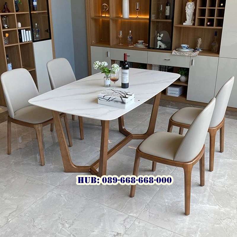 Kombinasi antara kedua bahan ini terkenal dengan kilau alami  marmer dan pola urat khasnya. Marmer memberikan kesan mewah, bersih, dan berkelas, sekaligus menghadirkan nuansa modern dalam ruang makan.Sementara itu, bagian kaki meja dibuat dari kayu jati pilihan. Kayu jati dikenal sebagai salah satu jenis kayu terbaik dengan serat halus, warna cokelat keemasan yang indah, serta daya tahan yang luar biasa terhadap rayap, kelembapan, dan usia pemakaian.Set ini dilengkapi dengan 6 kursi yang dirancang serasi dengan meja, sehingga menciptakan harmoni antara fungsionalitas dan estetika. Kursi ini dibuat dari material kayu jati dengan warna yang senada dengan meja makan dengan tambahan bantalan empuk untuk memberikan kenyamanan maksimal saat digunakan. Enam kursi memberikan kapasitas yang ideal untuk keluarga besar maupun jamuan makan bersama tamu.