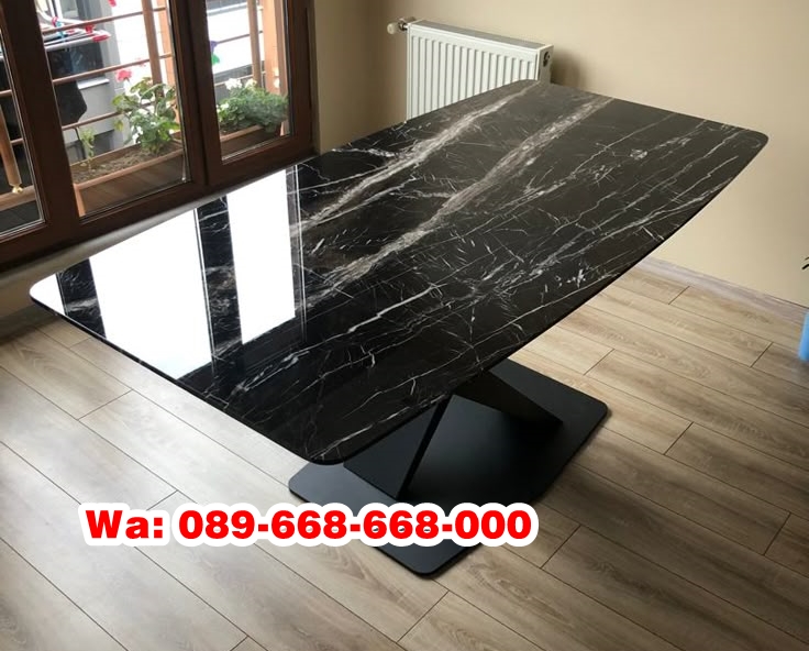 Meja makan ini banyak orang yang ingin menggunakan karena terbuat dari bahan yang berkualitas bagus sehingga bisa digunakan dalam jangka yang panjang, Meja makan marmer ini cocok untuk anda yang tidak suka mengganti furniture an cukup yang berkualitas agar tahan lama. jenis marmer cukup banyak di dunia pasaran, namun marmer yang ada di toko kami kebanyakan menggunakan bahan marmer import yang kami beli langsung dari negara italia. marmer hitam yang kami gunakan termasuk jenis marmer portoro dengan warna hitam dan corak abu abu halus yang unik.  Meja Marmer Hitam Kaki Besi sangat populer dalam desain interior karena tampilannya yang elegan, mewah, dan dramatis.