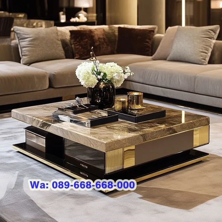 Coffe table adalah meja rendah yang dirancang untuk ditempatkan di area tempat duduk untuk mendukung minuman, remote control, majalah, buku, benda dekoratif, dan barang kecil lainnya dengan nyaman. Coffe table saat ini banyak ditemui pada ruang tamu atau ruang keluarga. meja ini bisa digunakan dalam jangka waktu yang lama tanpa kehilangan kualitasnya. Meski demikian, perawatan tetap diperlukan agar permukaan marmer tidak ternoda oleh cairan asam seperti kopi, teh, atau jus. Dengan perawatan yang tepat, meja ini dapat mempertahankan kilau alaminya selama bertahun-tahun.