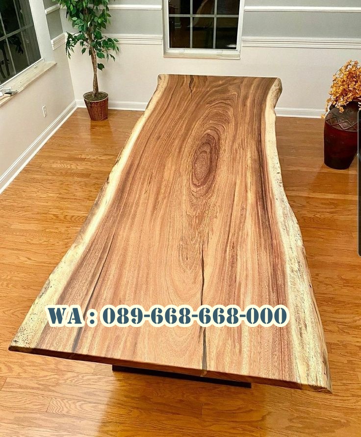 Meja Meeting Kayu Trembesi Utuh memiliki tampilan alami dan elegan, terbuat dari bahan kayu trembesi utuh tanpa sambungan. Kayu trembesi memiliki serat yang kuat dan tahan lama, sehingga mampu menopang beban berat dalam jangka waktu lama. Corak serat alami pada kayu trembesi memberikan kesan natural dan elegan pada meja meeting, menambah nilai estetika ruangan. Meja meeting dari kayu tembesi utuh memiliki ukuran yang besar dan panjang, mampu menampung banyak orang saat rapat berlangsung. Meja ini memberikan kesan mewah dan alami pada ruang rapat, serta dikenal tahan lama dan kokoh.