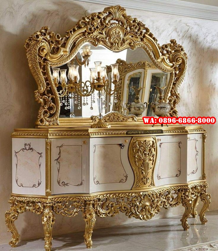 Ciptakan ruang rias impian Anda dengan Meja Rias Cermin Mewah Ukir. Dirancang dengan detail ukiran artistik yang memukau, meja rias ini menghadirkan keindahan dan kemewahan klasik yang tak lekang oleh waktu. Terbuat dari kayu solid yang kuat dan tahan lama, memberikan stabilitas dan daya tahan jangka panjang. Dihiasi dengan finishing elegan berwarna emas yang menambah kesan mewah pada setiap detail ukiran. Dilengkapi dengan cermin besar berbentuk elegan, bingkai ukiran yang indah menambah sentuhan mewah dan vintage, memungkinkan Anda melihat penampilan dengan sempurna. Cermin besar dengan bingkai ukiran yang elegan, memberikan kesan mewah dan membuat ruangan terasa lebih terang dan luas. Setiap ukiran pada meja dan bingkai cermin dirancang dengan keahlian tinggi, memberikan kesan vintage yang kaya akan detail dan keindahan. Setiap elemen dari meja ini memancarkan keanggunan, membuatnya lebih dari sekadar furnitur—ia adalah karya seni yang akan mempercantik setiap sudut ruangan Anda.