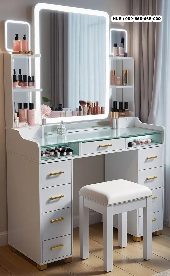 Sangking banyaknya model meja rias membuat bingung mau memilih model yang bagaimana. Kalau dari kami merekomendasikan Meja Rias Minimalis Cermin LED, kenapa kami merekomendasikan produk ini? karena selain desainya yang simpel dan tidak memakan banyak tempat, meja rias ini memiliki tampilan bersih, rapi dan kokoh selain itu, permukaanya menggunakan kaca tebal yang tidak mudah pecah, dilengkapi dengan sekat dan laci yang sangat banyak untuk menaruh perlengkapan, tidak lupa dengan cermin jernihnya dan lampu LED yang membantu penerangan saat bersiap-siap makeup maupun skincare.