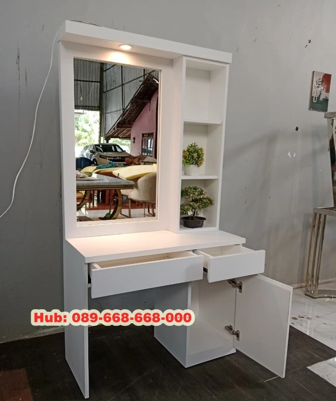 Sekarang ini banyak kamar yang perempuan yang ada meja rias, sebab dengan adanya meja rias dapat mempermudah untuk perempuan saat memakai mack up karena dilengkapi dengan kaca serta dengan adanya meja rias tersebut dapat juga sebagai tempat untuk meletakkan aksesoris mackup dan skincare agar lebih rapih. Meja Rias Minimalis Lampu ini kami menggunakan bahan kayu jati dengan finishing cat duco putih kami sengaja memilih dengan warna cat duco karena memberikan permukaan yang sangat halus dan berkilau (glossy finish), memberikan tampilan yang modern dan elegan pada furnitur dan kendaraan.