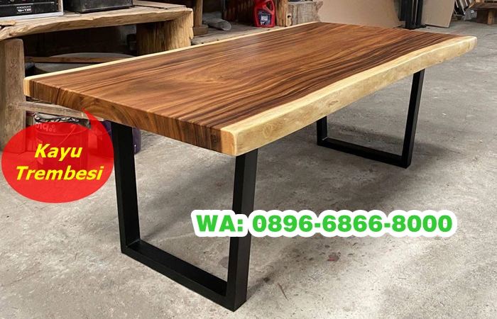 Meja makan memang menjadi kebutuhan pokok yang digunakan sebagai tempat untuk menyajikan makanan dan untuk tempat makan. Produk meja makan menjadi produk yang sangat terlaris, banyak sekali para customer dari sabang hingga merauke yang mencari produk ini, dan banyak memesan juga di toko kami, hehehe…. Karena memang kualitas dari toko kami sangat bagus dan terjamin. Meja Trembesi Kaki Besi Utuh terbuat dari bahan kayu trembesi utuh tanpa sambungan sama sekali. Kayu trembesi memiliki daya tahan yang baik dan cukup kuat sehingga sering dijadikan bahan utama dalam membuat meja makan, sedangkan untuk kaki meja makan ini terbuat dari bahan besi hollow yang sangat tebal