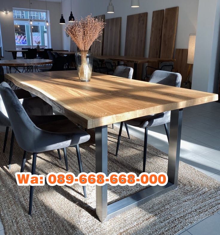 Meja Trembesi Utuh Stainless Palembang dengan ketebalan meja memberikan kesan yang solid dan berwibawa, sangat cocok untuk ruang makan atau pertemuan keluarga besar. meja trembesi memberikan kesan alami, hangat, dan mewah pada ruangan dan yang pasti cocok untuk segala desain interior dari minimalis hingga modern.