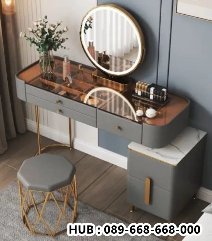 Lampu LED yang terpasang pada bagian cermin memberikan cahaya yang lembut dan stabil, sehingga membantu menampilkan warna makeup secara lebih jelas. Selain itu, pencahayaan LED dikenal hemat energi dan memiliki umur pakai yang panjang, umumnya juga dilengkapi dengan laci penyimpanan yang cukup luas. Laci tersebut sangat berguna untuk menyimpan berbagai perlengkapan kecantikan, skincare, hingga aksesori agar tetap tertata rapi dan mudah dijangkau.